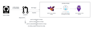 All the configurations are stored in GitHub. When the network engineer creates a new PR with its changes, it will trigger GitHub CI pipeline actions to validate the configs using Batfish, Containerlab and SuzieQ.